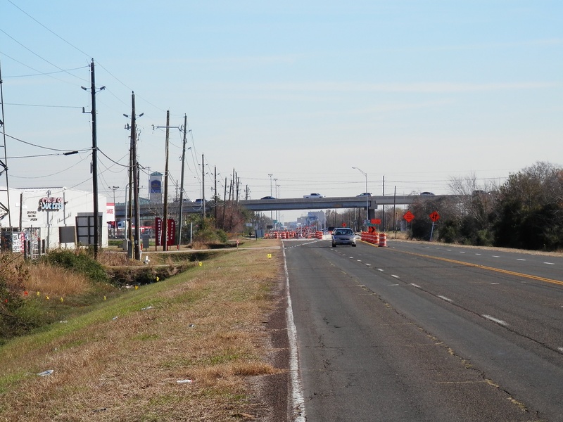 Dec 2014a 053.JPG : Eastbound on Hempstead Rd. at the SH-6 overpass, Dec. 2014. Construction has reduced Hempstead to two lanes and has stalled at this point.