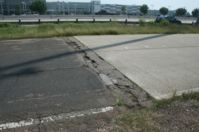 May 2013a 041.jpg : A close-up view at the separation between Hempstead Rd. and the 290 frontage road. The original black asphalt surface ends abruptly, and becomes the grooved concrete we are used to in modern roadways. A haphazard filling of asphalt between the two road surfaces has been the band-aid on this issue for decades. Just one of those little imperfections that was never sorted out during the development of 290 in the 1980's.