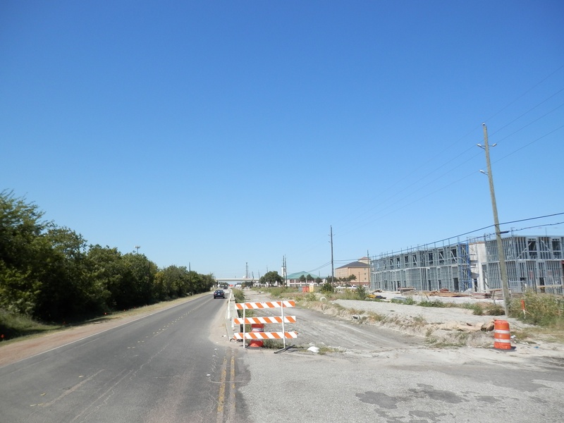 Aug 2016a 069.JPG : Facing west along the Hempstead Road corridor towards the SH-6 overpass. The hotel on the right is nearly finished, but the state of Hempstead Rd. is poor. One end is a construction zone, the other end is missing a huge section of the westbound lanes on either side of SH-6, which had been in that configuration for a few years at this point.