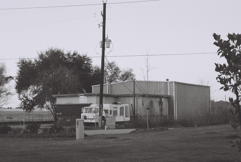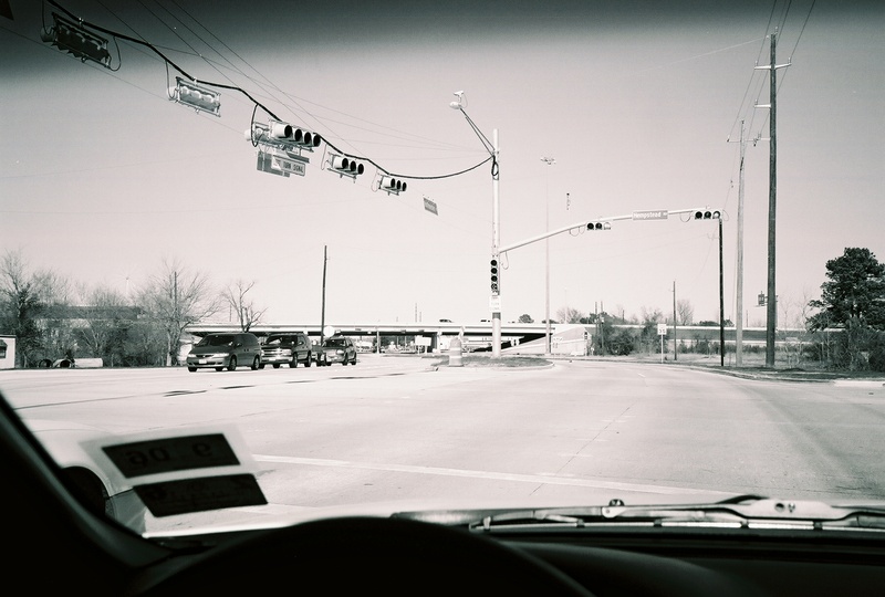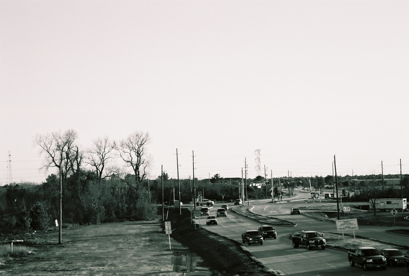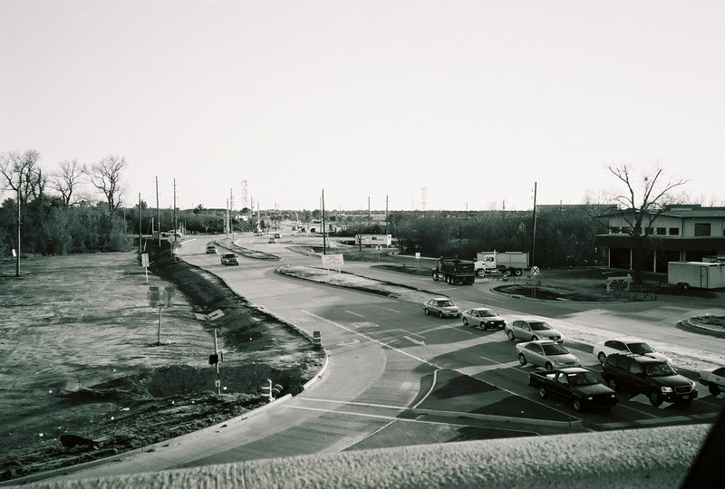 Feb 2014a 004.jpg : Black & white photo of the intersection of the 290 frontage road with Hempstead Rd., facing south.