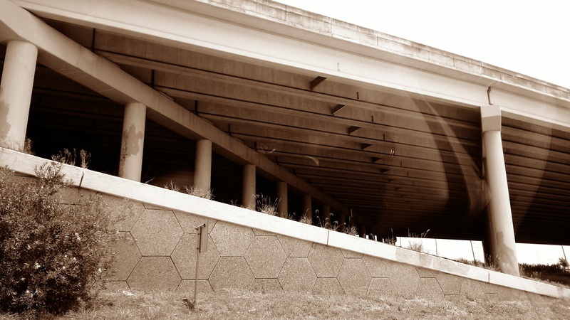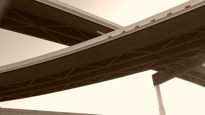 Feb 2014a 005.jpg : Black & white photo similar to the previous one looking a bit more to the left at the other overpasses.