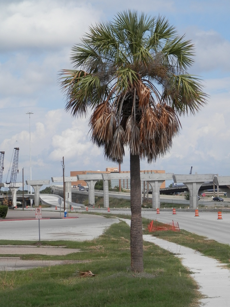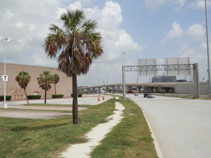 Aug 2014a 060.JPG : The exit ramp from 290 to Hempstead Rd., facing north from the old east exit drive (the sad palm tree).