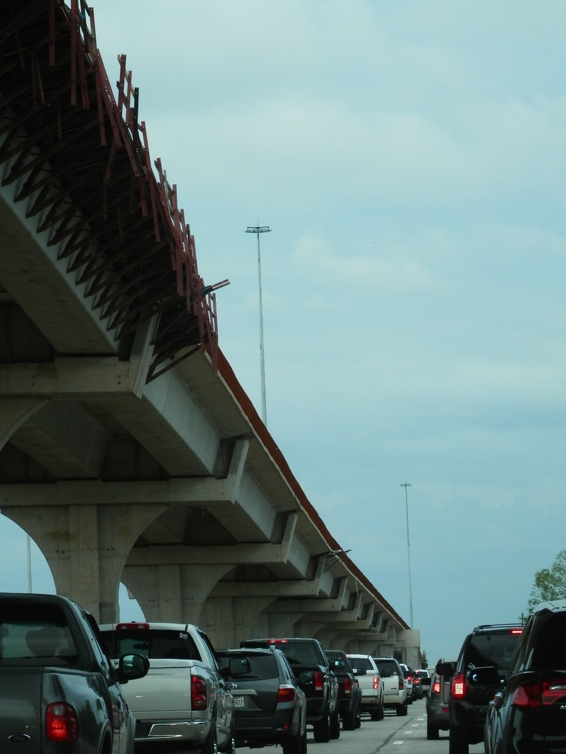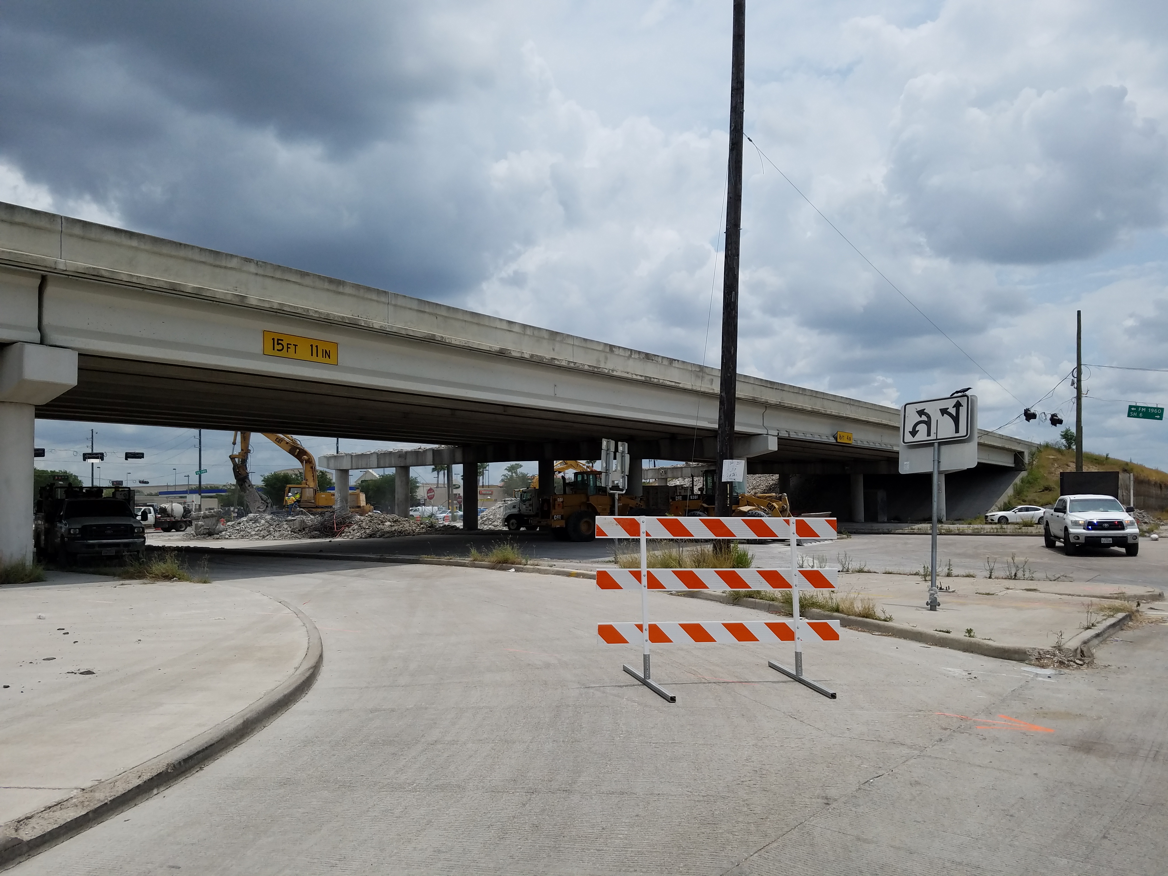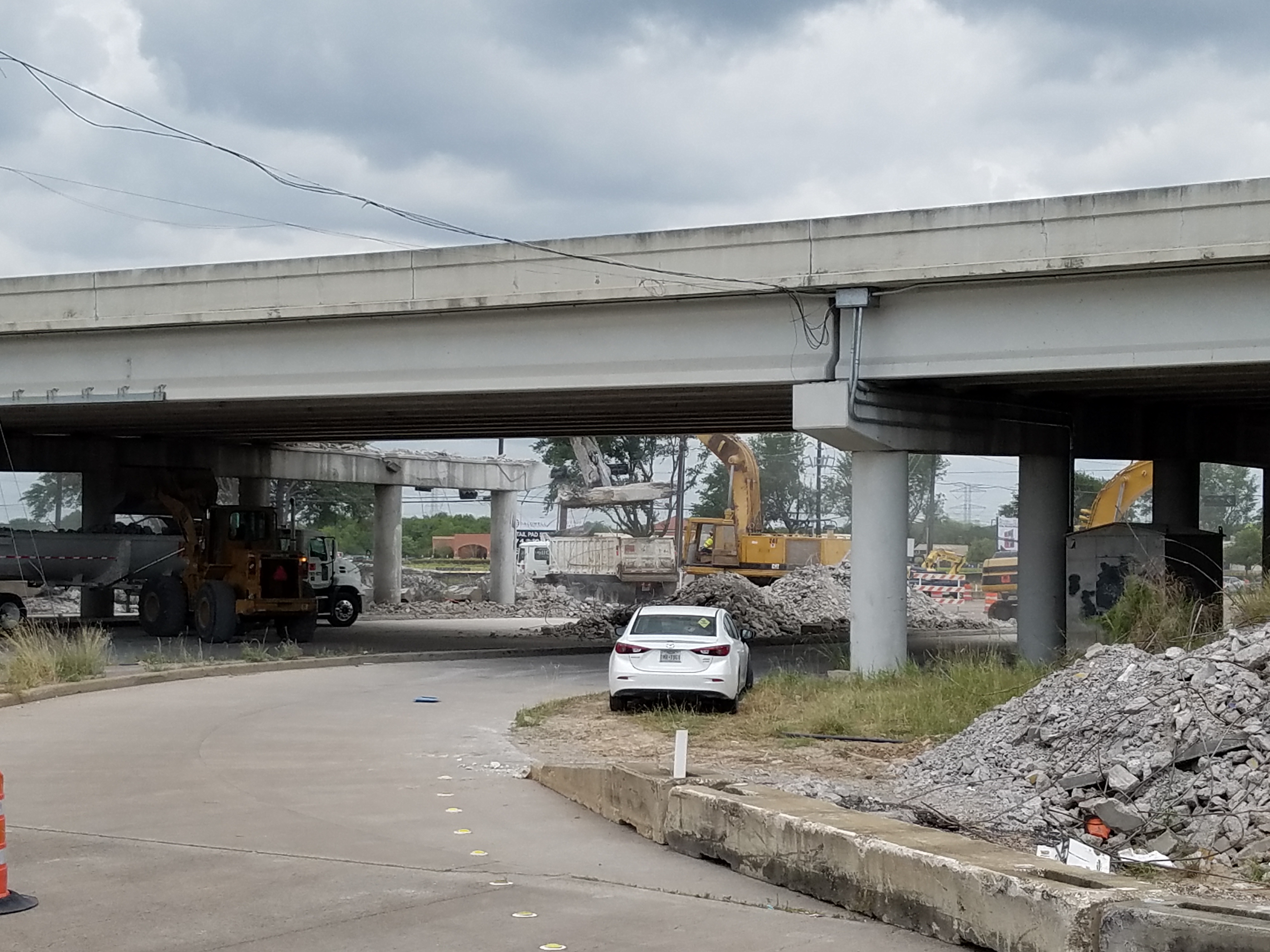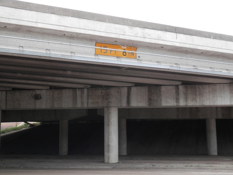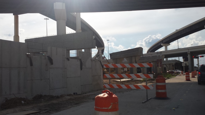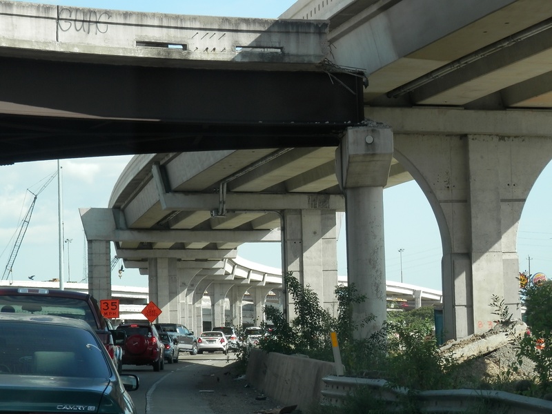 May 2015a 023.JPG : The end of 290 at the 610 Loop, taking the north loop exit ramp. The old Park & Ride structure overhead has been partially demolished, and is only inches away from the new I-10 connector ramp.